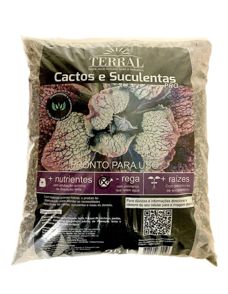Terral Suculentas Profissional foi desenvolvido pelo Guydo Horta, produtor de cactos e suculentas, que tem mais de 1500 espécies em seu cactário. Com matérias-primas nobres, o produto não compacta, melhora a drenagem das raízes e já vem com adubo de liberação lenta, que nutre e hidrata as plantas de acordo com suas necessidades.
